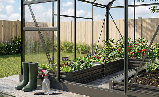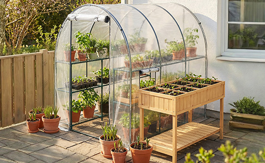 A peaceful backyard garden features a clear greenhouse surrounded by lush greenery and blooming flowers. Beside it, a cozy outdoor dining set sits on a stone patio, creating a charming space for relaxing meals. Raised wooden planters and garden tools add a practical touch, blending gardening and outdoor living into one inviting setting.