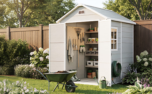 Create a practical backyard growing corner with a compact greenhouse and wooden storage cabinet. Keep seedlings protected, tools organized, and raised beds thriving—all in one tidy, sunlit garden space.