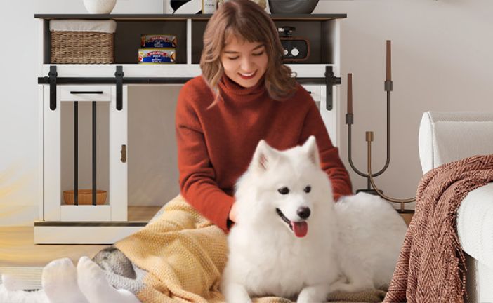 A bright, modern living room where pets and people share comfort—featuring a stylish hidden dog crate, organized pet essentials, soft seating, and a calm, welcoming home atmosphere.