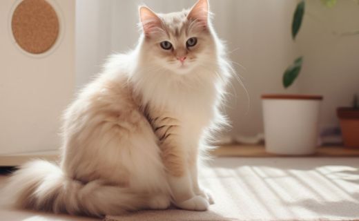 A serene living room blends pet comfort with modern design, featuring a hidden litter cabinet, raised feeding station, and a plush cat bed that keeps the space tidy and stylish.