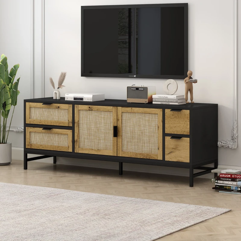 Vinsetto Elegant Rattan TV Stand for TVs up to 65", Boho Style Media Console with Adjustable Shelves, Cable Management, Steel Gray