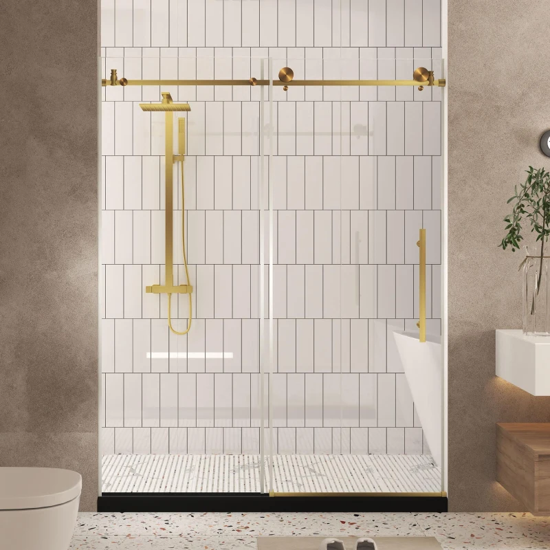 Frameless Shower Door with Anti-Shatter Safety Film and Bottom Water-Blocking Strip, Panel for Bathroom, 60" L x 0.5" W x 76" H, Brushed Gold