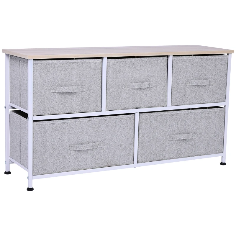 HOMCOM 40" L 5 Drawer Horizontal Storage Cube Dresser Unit Bedroom Organizer Living Room Shelf Tower with Fabric Bins, Light Gray