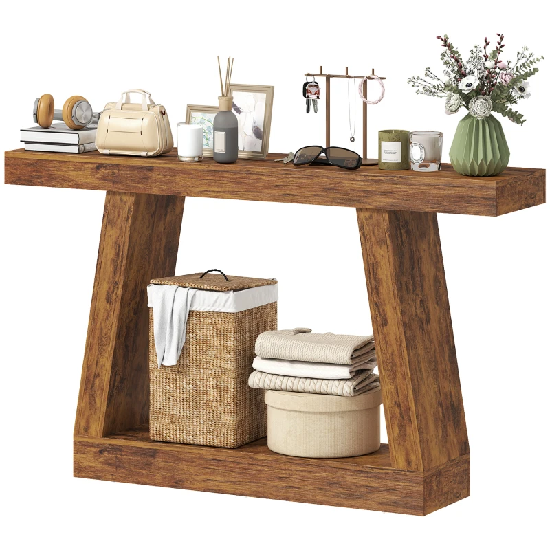 Elevate your home with this HOMCOM 55.1" console table in a rich deep brown finish. Its bold, thick design creates a sophisticated focal point for your entryway or living room. The spacious dual-tier storage features a deepened tabletop and open shelf to display cherished family photos or decorative baskets, keeping your space organized and inviting. A timeless addition that blends elegance with practicality for any room.