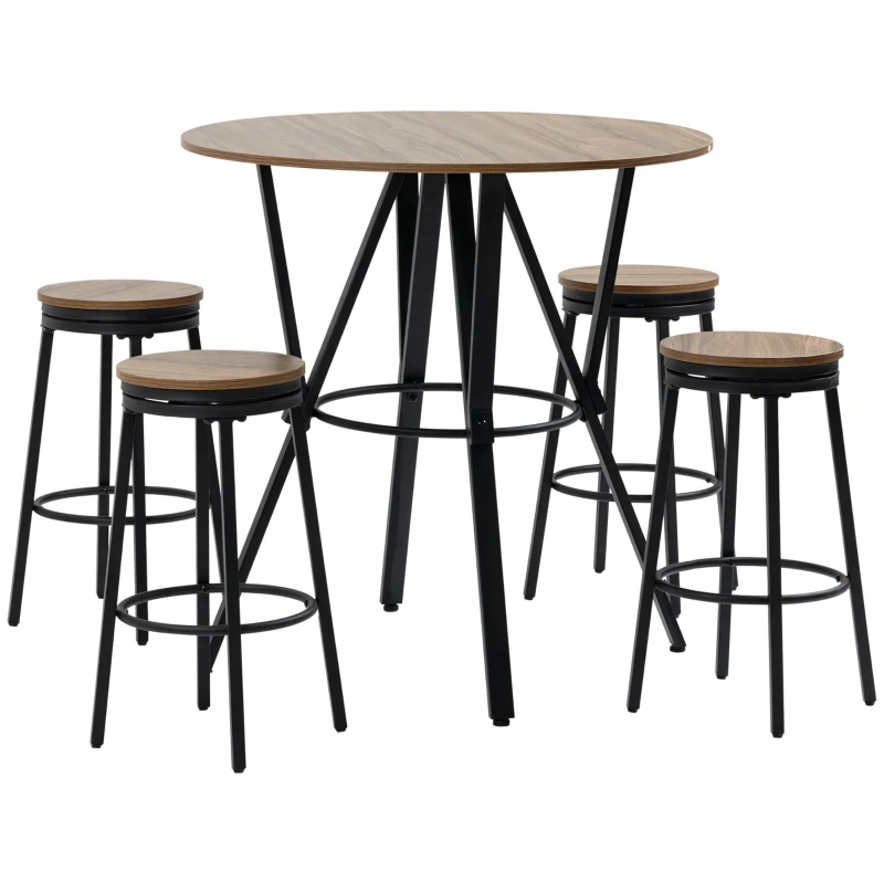 HOMCOM Industrial Bar Table and Chairs Set of 5, Round Dining Table & 4 Stools with Swivel Seat for Pub, Kitchen, Light Brown