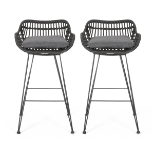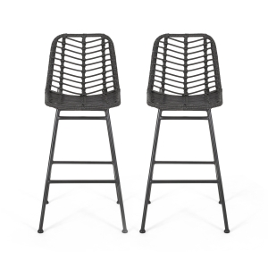 Industrial Wood and Metal Barstool Set of 2 with Powder-Coated Iron Frame, Acacia Wood Seat, and Built-In Footrest, Accent Outdoor Patio Seating, 16.5" L x 17" W x 37.5" H, Brown