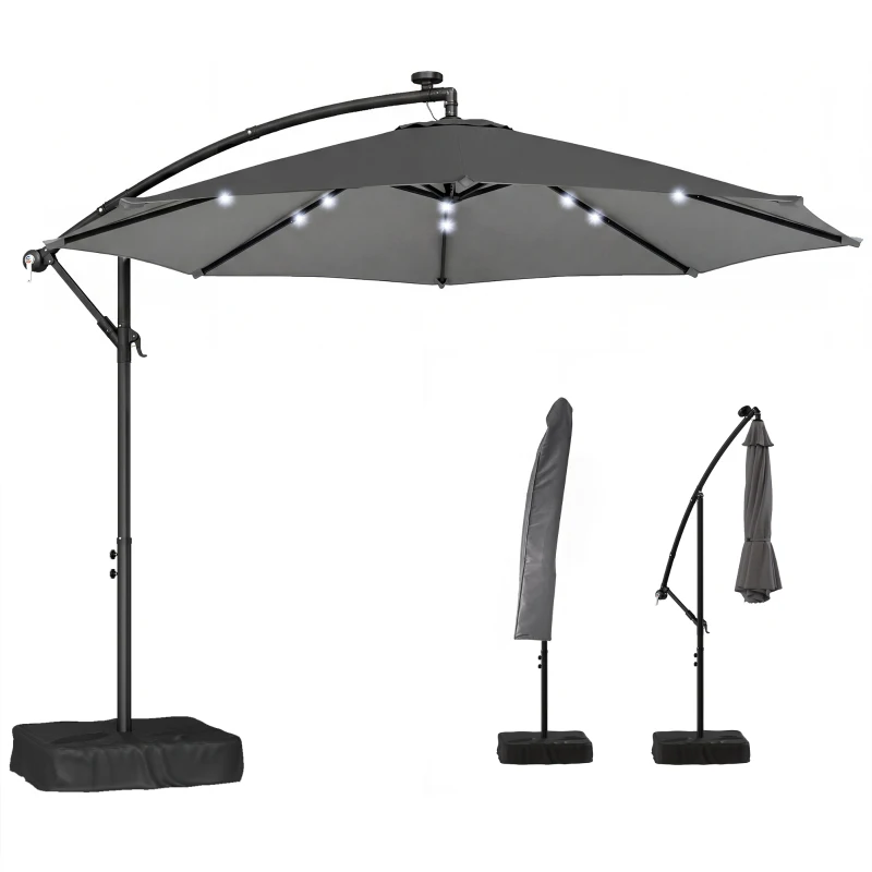 Outsunny 10 ft Cantilever Patio Umbrella with Light, Weight, Offset Hanging Outdoor Umbrella with Protective Cover, Dark Gray
