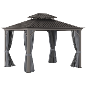 Outsunny 10' x 12' Hardtop Gazebo with Curtains and Netting, Permanent Pavilion Metal Double Roof Gazebo Canopy with Aluminum Frame and Hooks, for Garden, Patio, Backyard, Dark Brown