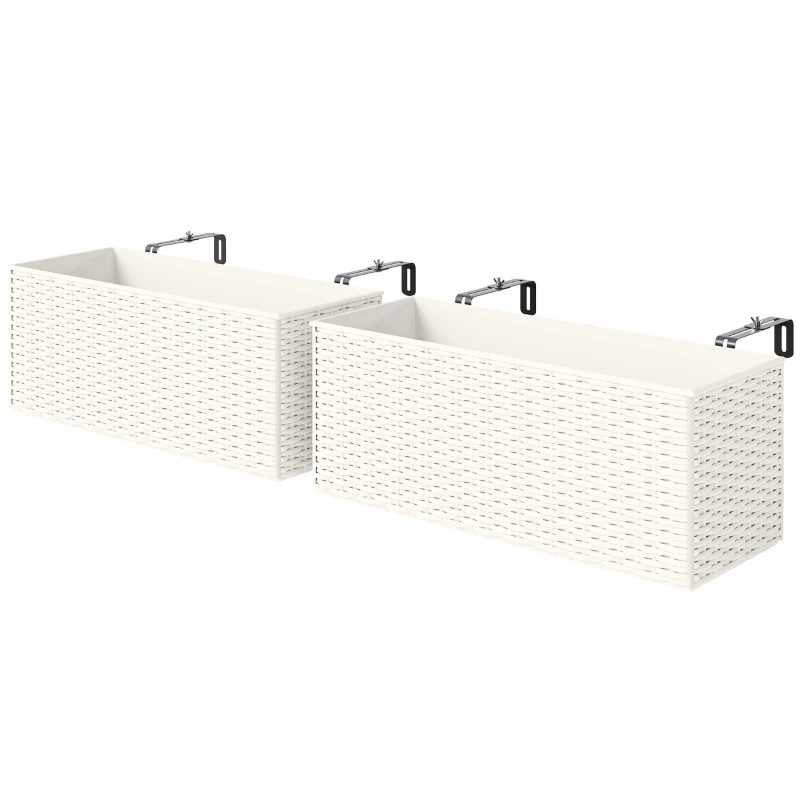 Outsunny 2 Pack 20 Inch Railing Flower Pots, Hanging Flower Pots with Hooks, Drainage Holes for Fence, Rattan Look, White