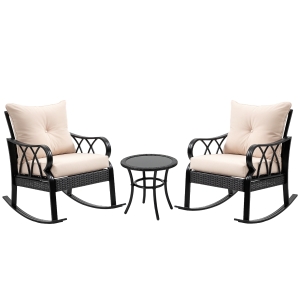 Outsunny Wicker Outdoor Rocking Chair Set, 3 Piece Patio Bistro Set with 2 Porch Rocker Chairs, Glass Top Coffee Table and Cushions, Patio Conversation Set for Balcony, Backyard, Cream White