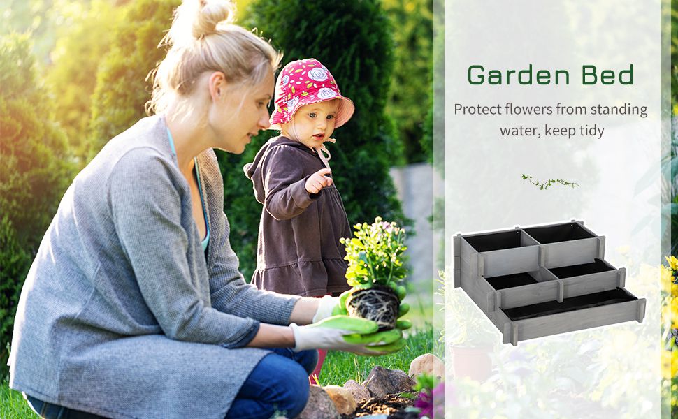 Outsunny 3 Tier Raised Garden Bed, Water Draining Fabric for Soil, Elevated Wood Flower Box for Vegetables, Herbs, Gray