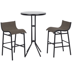 Outsunny 4 Piece Outdoor Bar Set with Umbrella, Patio Dining Set with 2 Folding Chairs, Wave Textured Tempered Glass Table for Backyard, Garden, Deck, Poolside, Brown