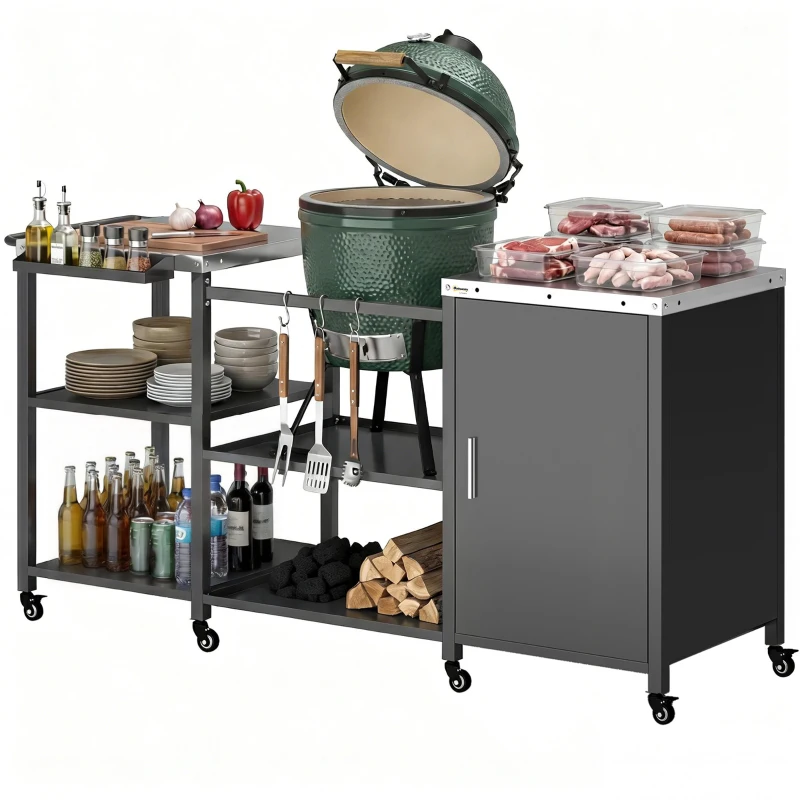 Outsunny Grill Table for Big Green Egg Grill, Heavy Duty Metal BBQ Prep Table with Stainless Steel Top and Storage Cabinet, Black