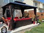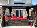 Outsunny 10' x 12' Hardtop Gazebo with Curtains and Netting, Permanent Pavilion Metal Double Roof Gazebo Canopy with Aluminum Frame and Hooks, for Garden, Patio, Backyard, Brown