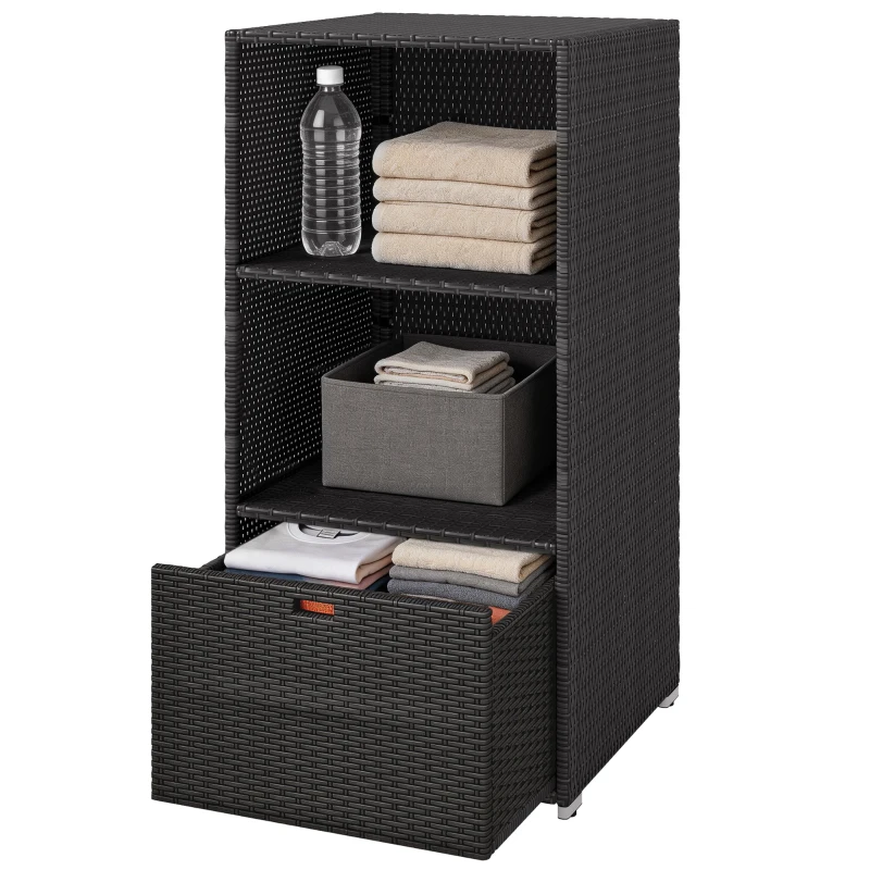 Outsunny Valet Pool Towel Rack, Water-Resistant PE Plastic Rattan Wicker Storage Organizer, 2 Shelves, 1 Basket Drawer