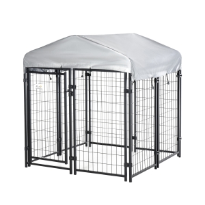 PawHut 8' x 4' x 6' Outdoor Dog Kennel, Welded Wire Heavy Duty Dog Run with 360° Rotating Bowls, Dog Kennel Outside with Waterproof & UV Resistant Cover, for S&M&L Dogs