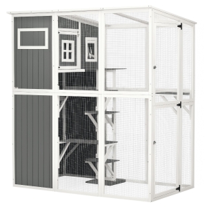 PawHut Wooden Outdoor Catio with Platforms, Asphalt Roof, Ramps, Gray
