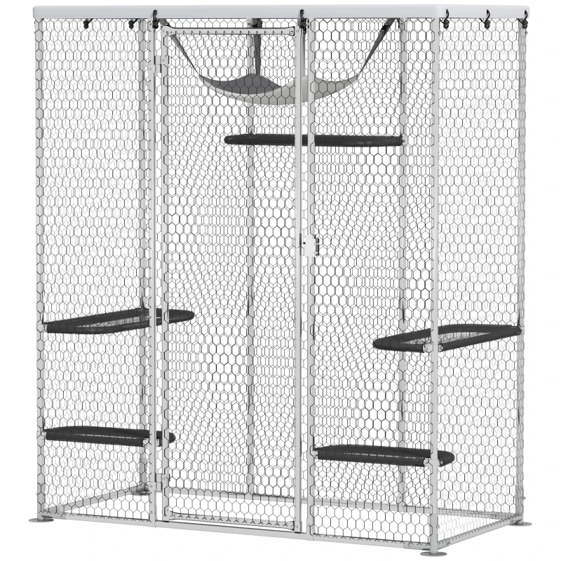 PawHut Catio Outdoor Cat Enclosure, Galvanized Steel Walk-in Cat Cage with Waterproof Cover, 5 Adjustable Platforms, Hammock