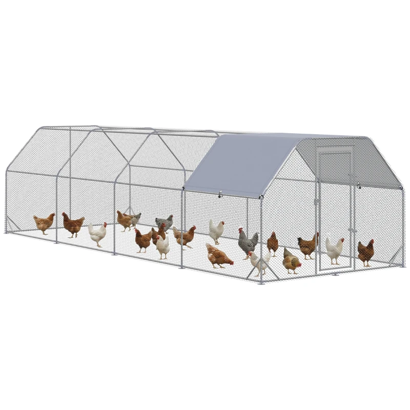 PawHut Large Chicken Coop Metal Chicken Run with Waterproof and Anti-UV Cover, Flat Shaped Walk in Fence Cage Hen House for Outdoor and Yard Farm Use, 1" Tube Diameter, 9.2' x 24.9' x 6.4'