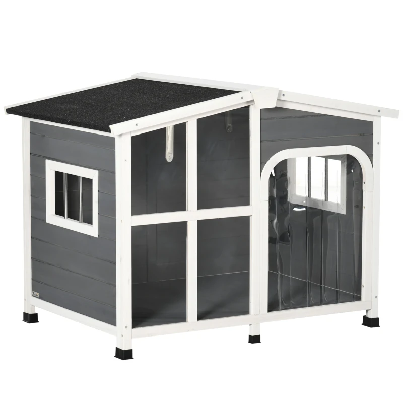 PawHut Outside Cabin-Style Wooden Dog House for Large Dogs with Openable Roof & Giant Window, Outdoor & Indoor Big Dog Shelter, Asphalt Roof, Gray