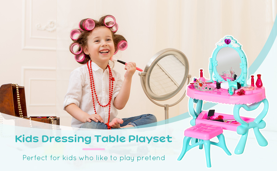 Qaba 2 In 1 Musical Piano Kids Dressing Table Set, 32 PCS Vanity Make Up Desk, Magic Glamour Princess Mirror, w/ Beauty Kit, Mirror, Stool, Light, Hair Dryer, for 3-6 Years Old, Pink, Blue