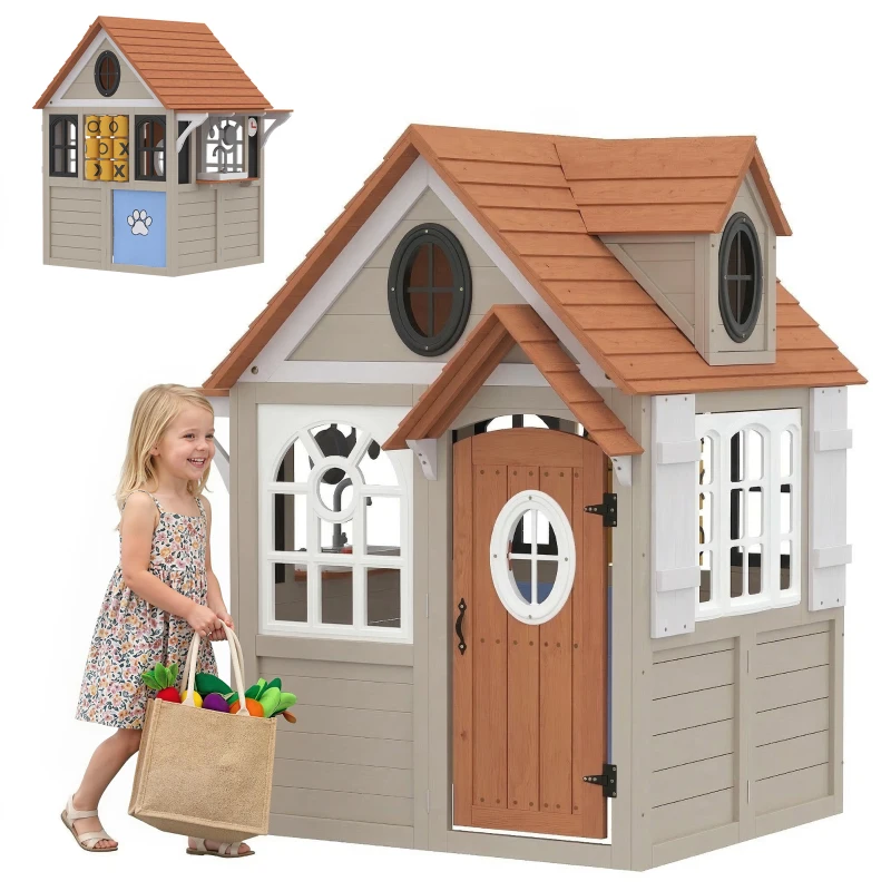 Qaba Outdoor Playhouse, Wooden Kids Playhouse with Dog Door, Cookware, Blackboard, Clock, Tic-Tac-Toe Roller for Backyard