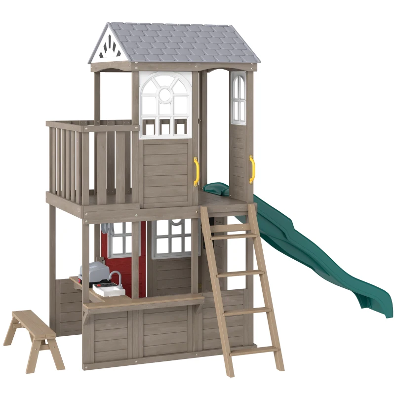 Qaba Two-Story Outdoor Playhouse, Wooden Kids Playhouse with Slide, Bench, BBQ Play Kitchen, Ladder, Lookout Platform, Clock