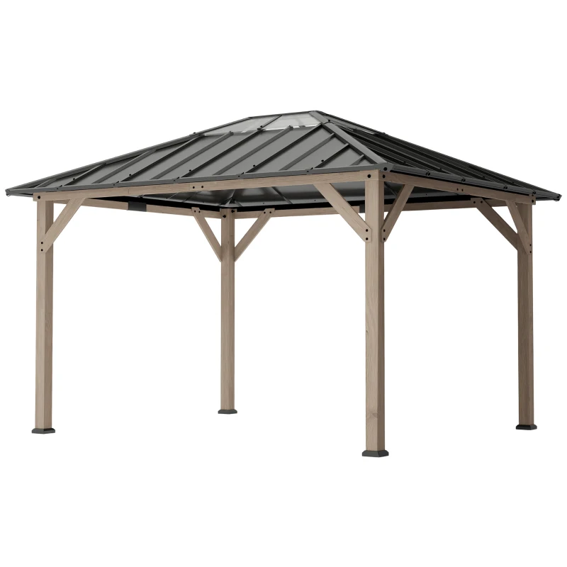Outsunny 10' x 12' Hardtop Gazebo with Galvanized Steel Roof, UPF50+ Wood Permanent Pavilion with Clear Roof Top, Light Walnut